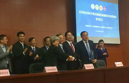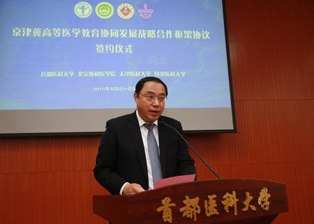 4月6日下午,我校校长崔慧先代表学校参加在首都医科大学举办的京津冀高等医学教育协同发展战略合作框架协议签署仪式,与北京协和医学院、首都医科大学、天津医科大学正式签署战略合作框架协议。国家卫计委科教司司长秦怀金、医政医管局正局级专员周军,教育部高教司副司长范海林,北京市委副秘书长郭广生,京津冀三地教育行政主管部门和卫生行政主管部门领导等出席仪式并讲话。
